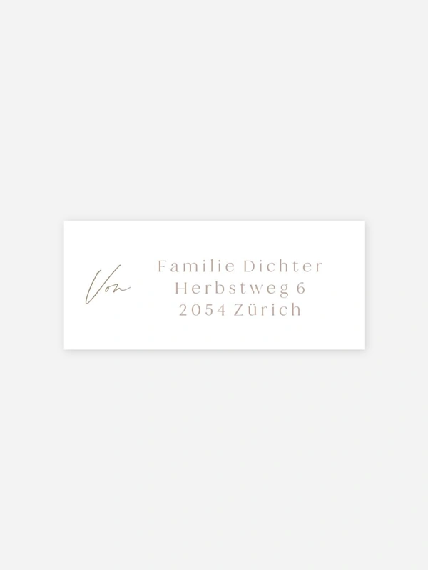 Der Absenderaufkleber "Magie des Lebens" besticht durch sein schlichtes, elegantes Design – ein kleines Detail mit großer Wirkung für eure Taufpost. Mit dem handgeschriebenen "Von" und der klar gesetzten Adresse wirkt er persönlich und zugleich zeitlos schön. So landet jede Einladung zur Taufe schon von außen mit einem besonderen Gefühl im Briefkasten eurer Liebsten. Im Gestaltungs-Tool passt du den Aufkleber ganz einfach mit euren eigenen Daten an – in wenigen Klicks fertig und bereit zum Versenden.