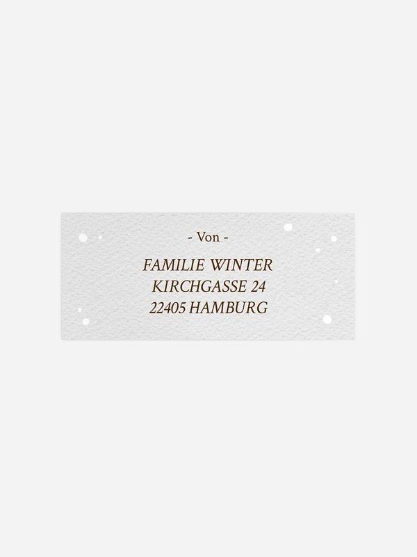 Gestalten Sie Ihre Postsendungen stilvoll und mühelos mit unseren personalisierbaren Absenderaufklebern "Schneemärchen"! Diese hochwertigen Aufkleber sind die perfekte Ergänzung zu unserer exklusiven Designserie und erleichtern Ihnen das Versenden von Briefen und Karten, indem sie das manuelle Beschriften per Hand überflüssig machen.
