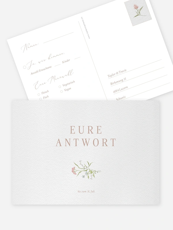 Die Antwortkarte "From Lover to Forever" wird gemeinsam mit der Hochzeitseinladung verschickt. Ihre Gäste können darauf ganz einfach mitteilen, ob sie an Ihrem großen Tag teilnehmen werden.