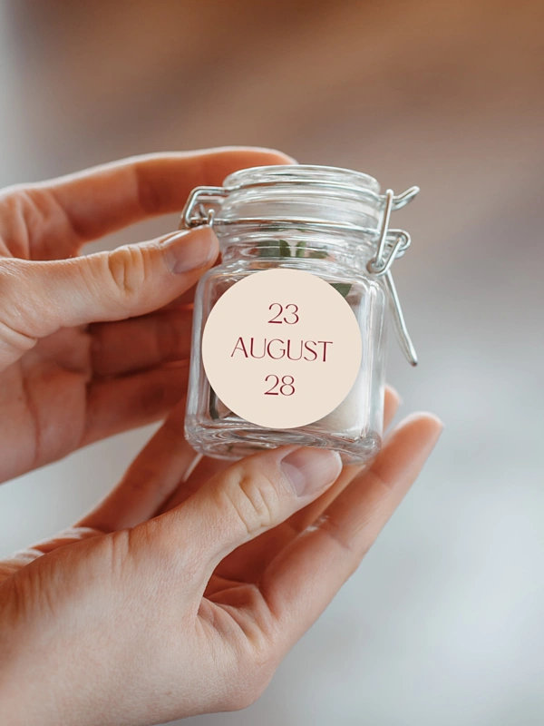 Personalisieren Sie die Hochzeitssticker "Traumtag" mit Ihren Namen und verschönern Sie damit die Gastgeschenke für Ihre Lieben.