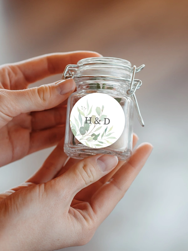 Personalisiere die Hochzeitssticker "Wiesenbouquet" mit euren Namen und verschönere damit die Gastgeschenke für eure Lieben.