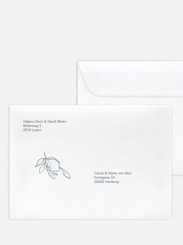 Der Umschlag "Mediterran" lässt das Herz des Empfängers ein wenig höher schlagen. Sie haben bei jedem Gast selbst die Wahl, ob sie den Empfänger händisch aufschreiben oder freilassen möchten.