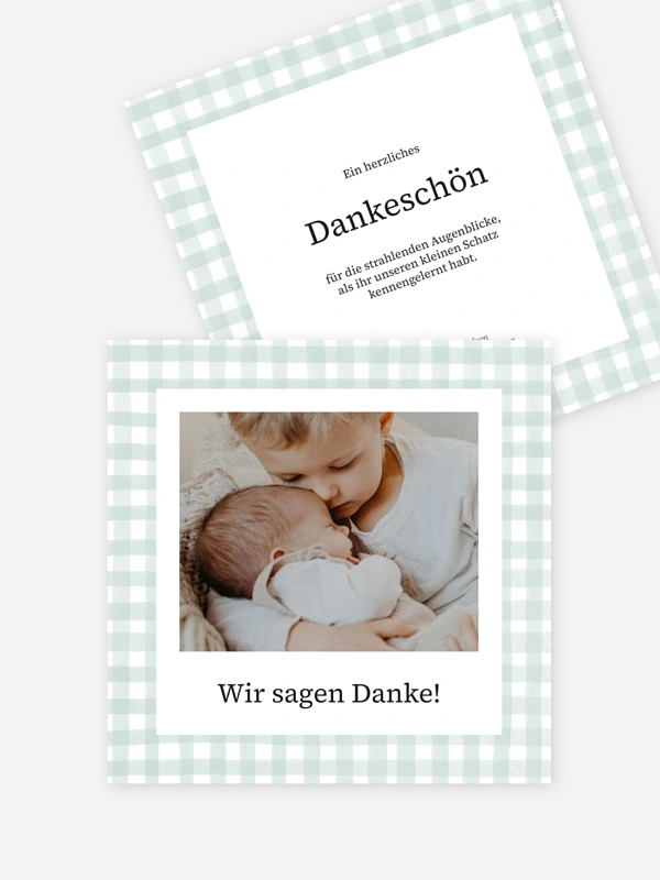 Die wunderschöne Dankeskarte zur Geburt "Zartes Vichy-Karo" ist eine herzliche Art, euren Lieblingsmenschen für die liebevolle Unterstützung und die vielen Aufmerksamkeiten zur Ankunft eures kleinen Wunders Danke zu sagen. Das zeitlose Design rahmt eure ersten gemeinsamen Momente liebevoll ein und macht eure Dankbarkeit für alle greifbar.