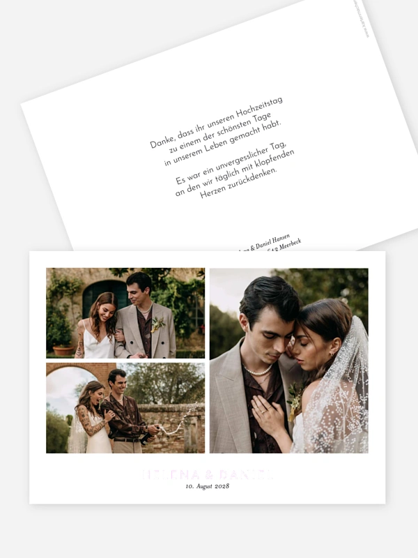 Mit eurer persönlichen Dankeskarte "Dankeszeilen" lasst ihr die schönsten Momente eurer Hochzeit noch einmal Revue passieren und teilt eure Freude mit allen Lieblingsmenschen. Das moderne Design mit Platz für eure liebsten Schnappschüsse ist die perfekte Art, um nach dem großen Fest von Herzen Danke zu sagen.