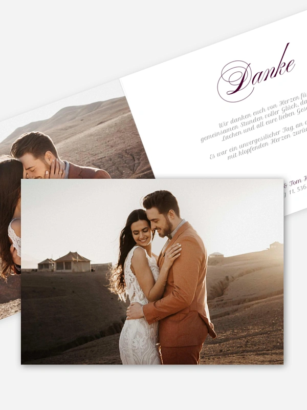 Mit der Dankeskarte "Liebevoller Dank" schickt ihr euren Herzensmenschen eine liebevolle Umarmung aus Papier und lasst die schönsten Augenblicke eures gemeinsamen Tages noch einmal aufleben. Die Gestaltung eurer Danksagung zur Hochzeit gelingt euch in unserem Gestaltungs-Tool ganz unkompliziert, sodass ihr eure Dankesworte mit wenig Aufwand, aber viel Herz festhalten könnt.