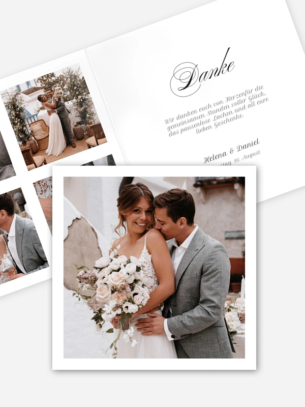 Mit der Dankeskarte "Zarte Erinnerungen" schickt ihr euren Liebsten ein herzliches Dankeschön, das die schönsten Momente eurer Hochzeit auf besonders liebevolle Weise festhält. Dank der einfachen Konfiguration im Gestaltungs-Tool wird eure Karte im Handumdrehen zum ganz persönlichen Erinnerungsstück, das wir für euch auf hochwertigen Papieren drucken.