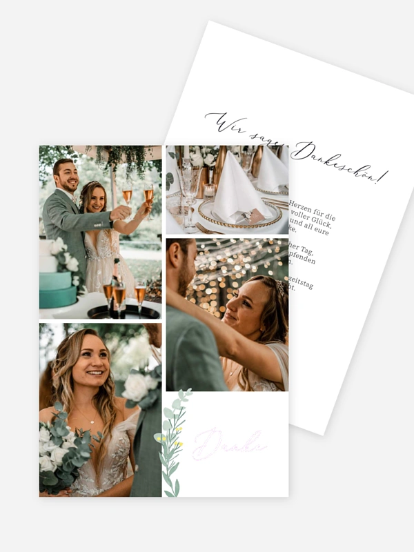 Eure Danksagung Hochzeit "Zarter Eukalyptus" lässt die schönsten Momente eures großen Tages noch einmal aufleben und teilt euer Glück auf ganz natürliche Weise. Die filigranen Zweige umspielen eure liebsten Hochzeitsfotos und verleihen eurer Botschaft eine herzliche, zeitlose Note. In unserem Gestaltungs-Tool könnt ihr eure Danksagung ganz persönlich gestalten und euren Lieblingsmenschen auf eure eigene Art Danke sagen. Wir begleiten euch mit hochwertigen Papieren und einer schnellen Lieferung, damit eure Post voller Liebe schon bald bei euren Gästen ankommt. Gestalte jetzt dein Set direkt online.