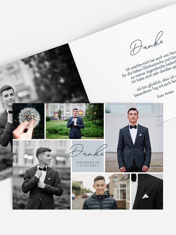 Der perfekte Abschluss eines besonderen Tages: Nach der Jugendweihe können Sie mit der Danksagung "Lasting Memories" allen Angehörigen und Freunden einen Fotogruß mit persönlichen Worten des Dankes zusenden.