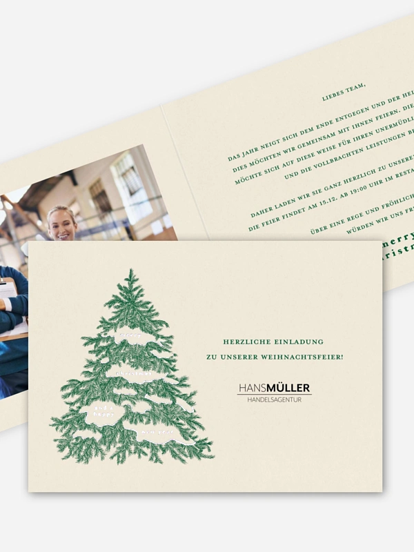 Mit der Weihnachtskarte "Vintage Tanne" laden Sie nicht nur stilvoll zur Weihnachtsfeier ein – Sie schenken zugleich einen Hauch festlicher Vorfreude. Das winterliche Design sorgt schon beim Öffnen der Post für weihnachtliche Stimmung. So beginnt das Feiern schon mit der Einladung.
