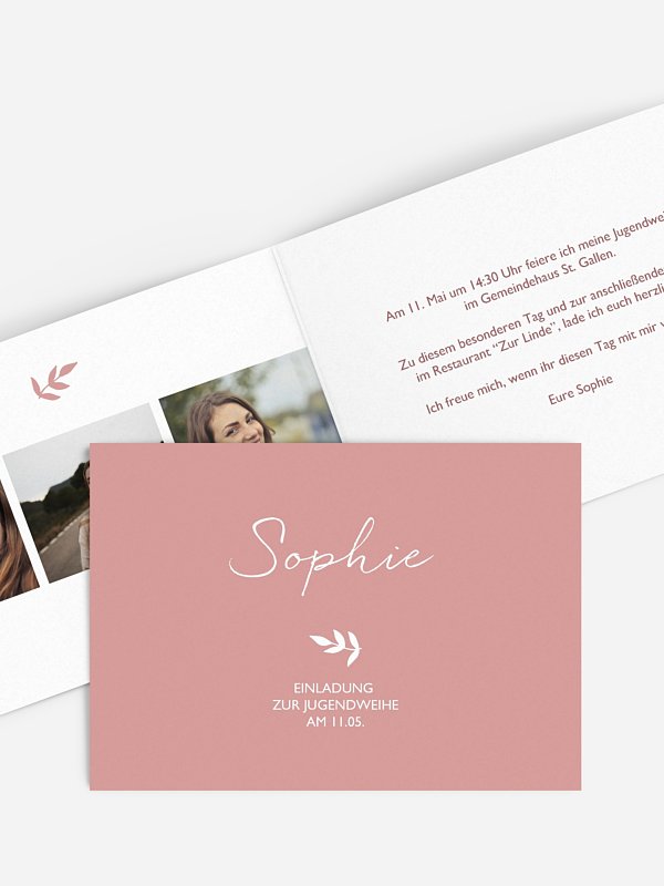 Ein kleines Zweiglein als dekoratives Zierelement schmückt die modern gestaltete Einladung zur Jugendweihe "Olivenzweig". Verleihen Sie der Einladung Leben mit Fotos und persönlichen Worten in einer von vielen verschiedenen Schriften.