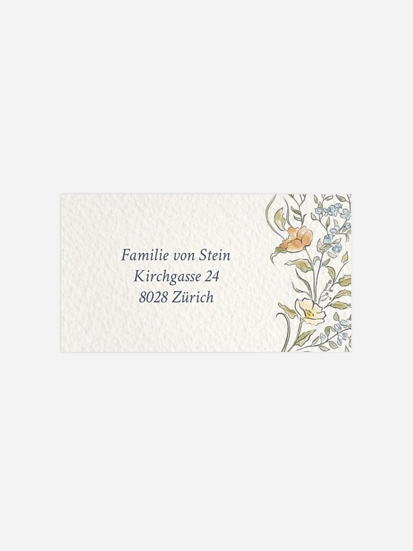 Personalisieren Sie die selbstklebenden Empfängeraufkleber "Dancing Flowers" mit den Adressen Ihrer Gäste und bringen Sie sie direkt auf den Umschlägen an – schnell, ordentlich und stilvoll.