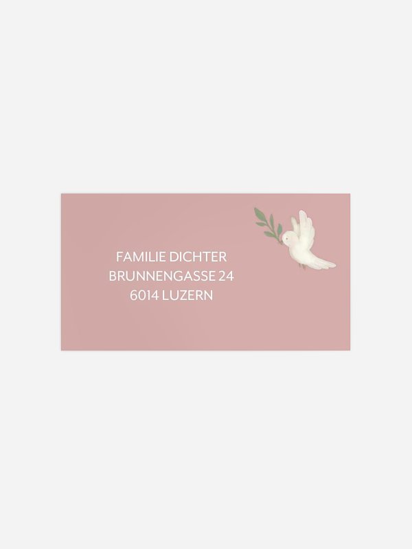 Die selbstklebenden Empfängeraufkleber "Segensboten" passen perfekt zur gleichnamigen Einladung und ersparen Ihnen das Beschriften der Kuverts per Hand.