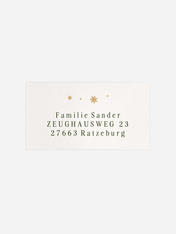 Gestalten Sie Ihre Postsendungen stilvoll und mühelos mit unseren personalisierbaren Empfängeraufklebern "Weihnachtliche Sterne"! Diese hochwertigen Aufkleber sind die perfekte Ergänzung zu unserer exklusiven Designserie und erleichtern Ihnen das Versenden von Briefen und Karten, indem sie das manuelle Beschriften per Hand überflüssig machen.