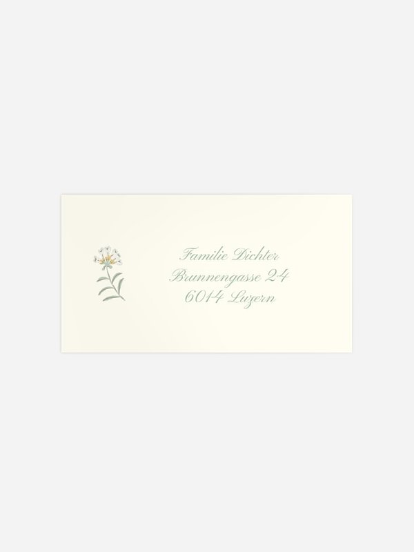 Die selbstklebenden Empfängeraufkleber "Wiesenflüstern" passen perfekt zur gleichnamigen Einladung und ersparen Ihnen das Beschriften der Kuverts per Hand.