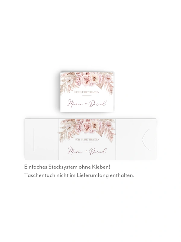 Die Banderolen für Freudentränen-Taschentücher im zarten Design "Blush Bloom" können für jeden Ihrer Gäste bei der Trauung ausgelegt werden.