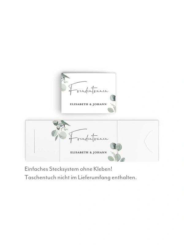 Für die schönsten Tränen: Legen Sie Ihren Lieben Taschentücher in den Banderolen des Designs "Eucalyptus Love" für die Trauung aus.