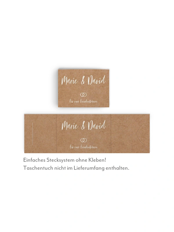 Für die schönsten Tränen: Legen Sie Ihren Lieben Taschentücher in den Banderolen des Designs "Lovestory" für die Trauung aus.