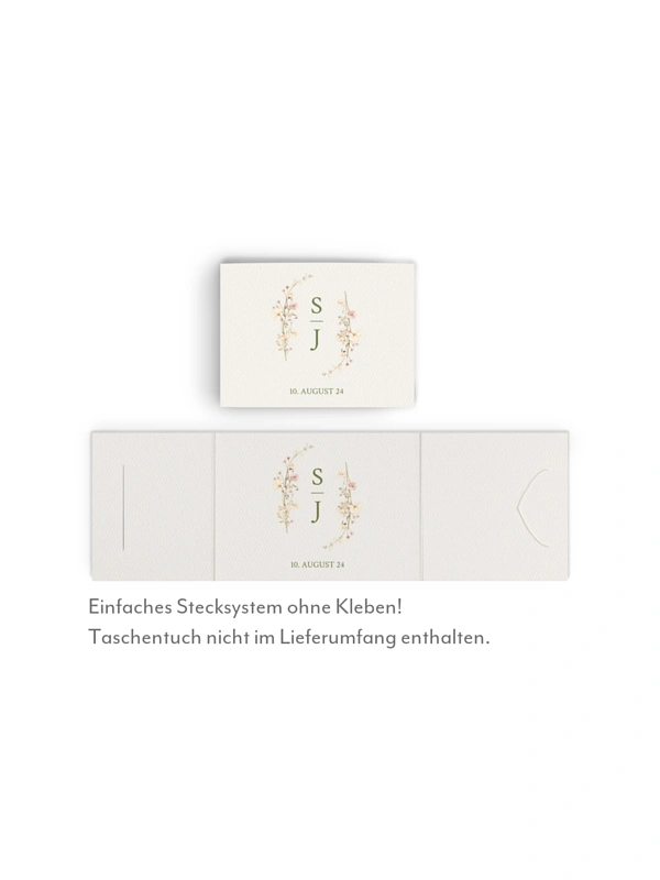 Halten Sie mit den Taschentüchern "Monogram Bloom" Freudentränen und Taschentuch-Chaos auf Ihrer Hochzeit stilvoll in Schach. Das zarte Design der Banderole mit Monogramm und floralem Design sorgen für einen edlen Hingucker und praktische Funktion zugleich.