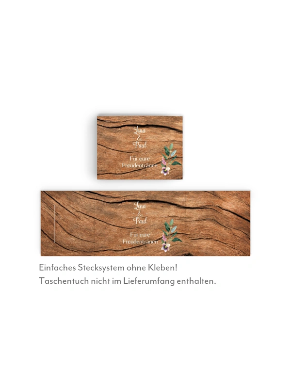 Die hübschen Banderolen "Rustic Bloom" für Freudentränen-Taschentücher sind ein charmanter Begleiter für Ihre Trauung.