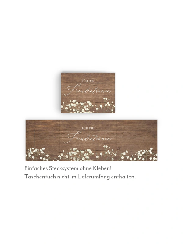 Für die Freudentränen bei der Trauung – die charmanten Taschentücher-Banderolen im Design "Rustic Gypsophilay".