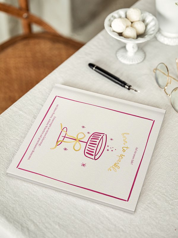Mit dem Gästebuch Geburtstag "Party Drink" sammelst du all die kleinen Highlights eurer Feier an einem Ort – von lieben Worten bis zu spontanen Insider-Momenten. Die verspielte Illustration mit Augenzwinkern macht sofort Lust aufs Anstoßen und lässt jede Seite nach guter Laune klingen. Ob als Erinnerung zum Geburtstag oder als Gästebuch für deine Party: Hier dürfen Wünsche, Anekdoten und kleine Skizzen einfach mitfeiern. Und das Beste: Du kannst alles ganz leicht im Gestaltungs-Tool personalisieren – wir kümmern uns um den hochwertigen Druck und eine schnelle Lieferung.
