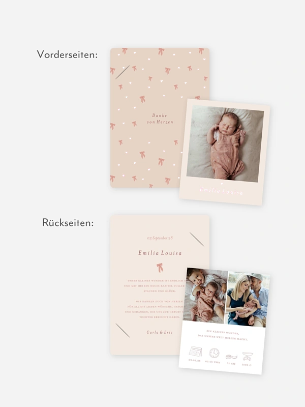 Entdeckt die süßeste Kooperation des Jahres! Wenn die zauberhaften Designs der dänischen Baby-Marke Cam Cam Copenhagen auf unsere liebevoll gestalteten Geburtskarten treffen, entsteht etwas ganz Besonderes für euren unvergesslichen Moment. Das moderne Design "Bows 1" mit seinen liebevollen, verspielten Details setzt das erste große Foto eures Schatzes wunderschön in Szene. So könnt ihr die Nachricht von der Geburt eures Babys auf eine stilvolle und persönliche Weise mit euren Liebsten teilen. Wir sorgen mit unserer hochwertigen Druckqualität und schnellen Lieferung dafür, dass ihr eure Karten schon bald voller Stolz in den Händen halten könnt.