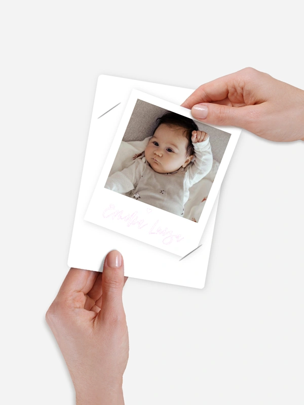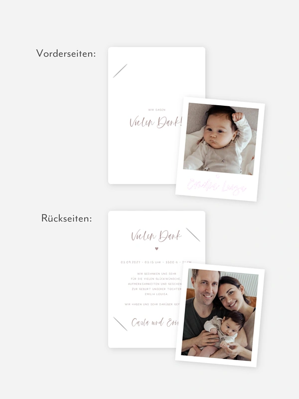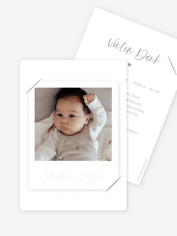 Zurückhaltend eingesetzte Designelemente rücken, auf der Geburtskarte "Lovely Blessing", die süssesten Fotos Ihres Babys auf stilvolle Weise in den Vordergrund.
