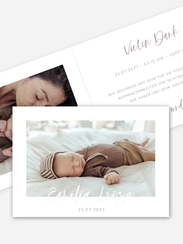 Zurückhaltend eingesetzte Designelemente rücken, auf der Geburtskarte "Lovely Blessing", die süssesten Fotos Ihres Babys auf stilvolle Weise in den Vordergrund.