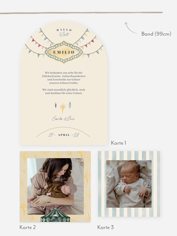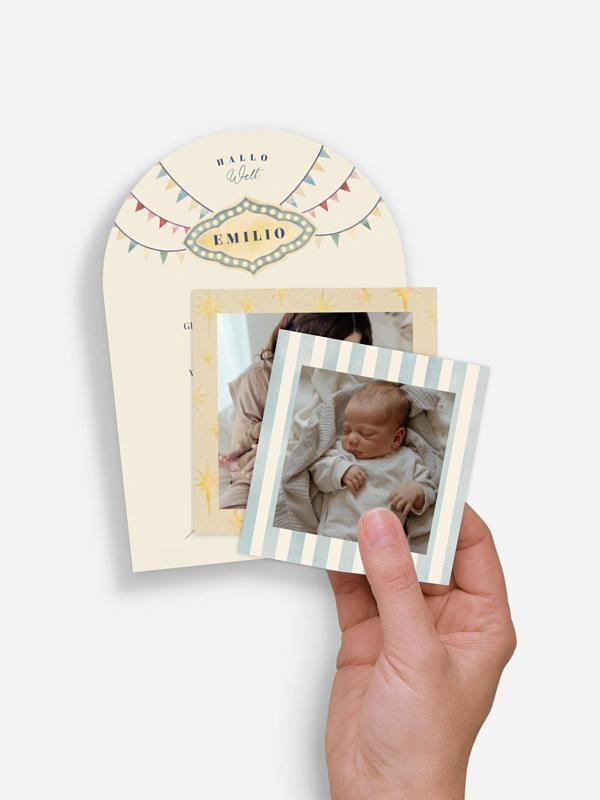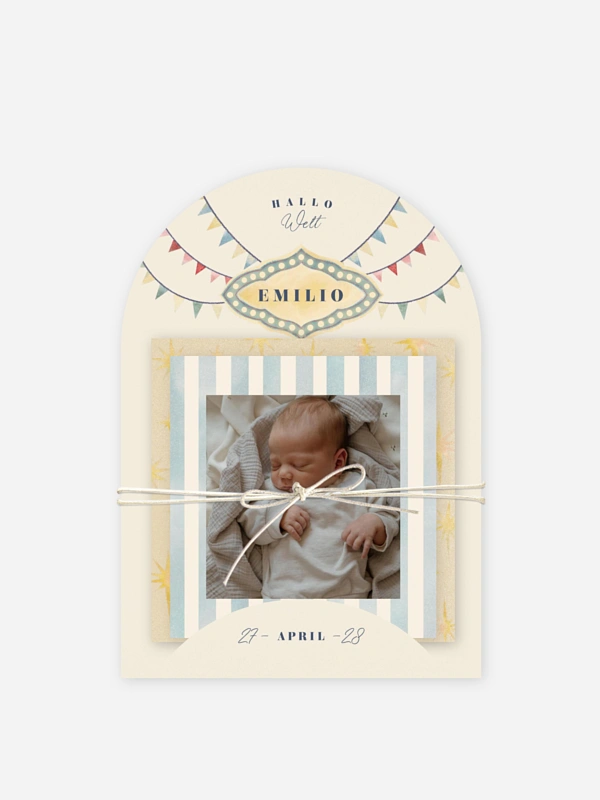 Mit der Geburtskarte „Manege frei“ begrüßt du dein kleines Wunder mit einem Augenzwinkern und viel Herz. Die fröhlichen Details lassen sofort ein Gefühl von Leichtigkeit entstehen und machen deine Botschaft an Familie und Freund:innen zu etwas ganz Besonderem. Dank hochwertiger Papiere und schneller Lieferung wird aus deiner Ankündigung ein Erinnerungsstück, das bleibt. Auf Wunsch kannst du dir vorab eine kostenlose Musterkarte bestellen – so gestaltest du in Ruhe dein perfektes Set.