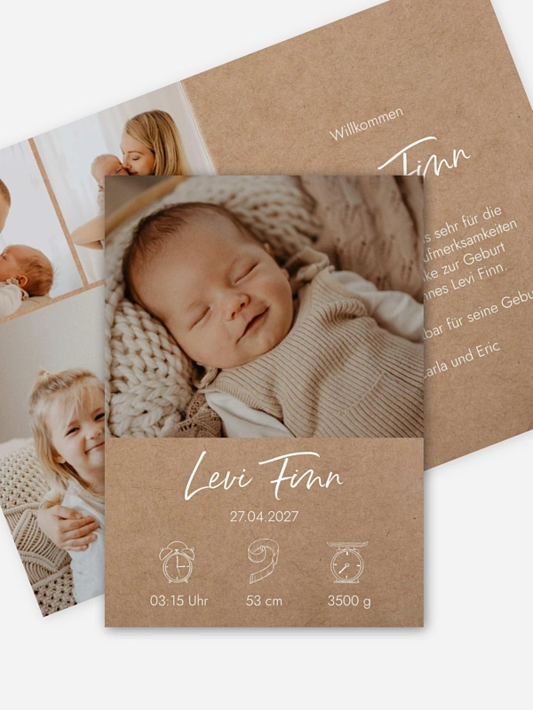 Unsere Geburtskarte "Sanftes Glück" verzaubert mit handgezeichneten, liebevoll illustrierten Piktogrammen, welche die wichtigsten ersten Daten um Ihren Liebling herum anzeigen.