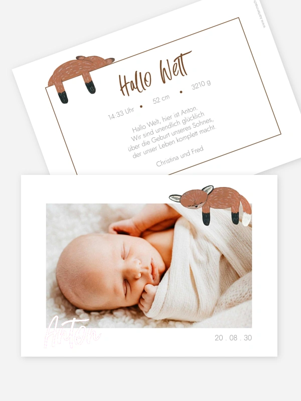 Die Geburtskarte "Schlafenszeit" kommt mit niedlichem Witz daher. Ihr Lieblingstierchen schläft auf dem Foto Ihres kleinen Schatzes und ist beim Wenden auch noch einmal von hinten zu sehen.