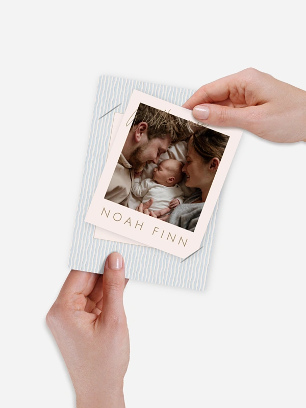 Die moderne Geburtskarte „Wavy Stripes“ bringt die schönsten ersten Momente deines kleinen Wunders ganz natürlich zum Ausdruck. Dein Lieblingsfoto steht im Mittelpunkt und macht die Karte zu einer liebevollen Erinnerung, die ihr mit Familie und Freund:innen teilen könnt. Hochwertige Papiere und unsere besondere Druckqualität sorgen dafür, dass jedes Detail wunderschön zur Geltung kommt. Du kannst dir vorab eine kostenlose Musterkarte bestellen und so in Ruhe entscheiden, welche Variante dir am meisten gefällt.