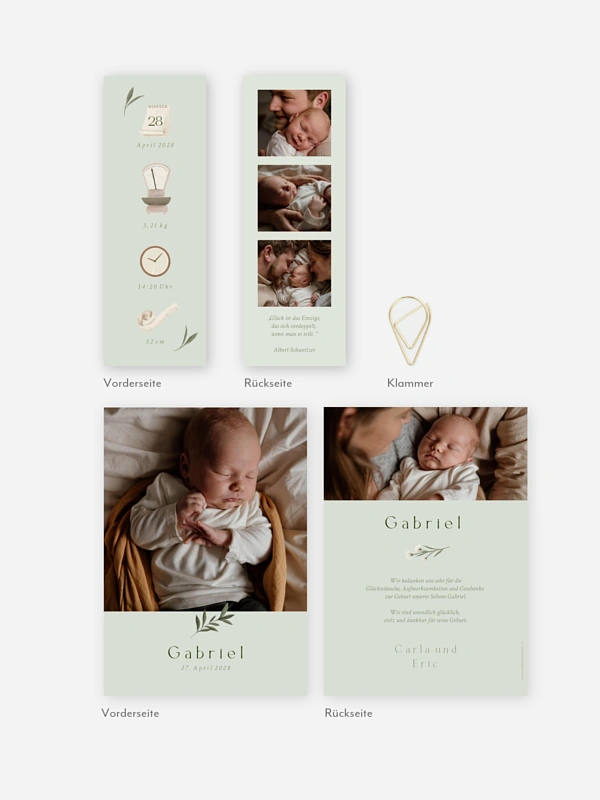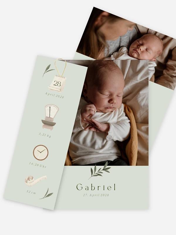 Unsere Geburtskarte "Willkommensgrün" verzaubert mit liebevollen Illustrationen, welche die wichtigsten ersten Daten Ihres Kindes anzeigen.