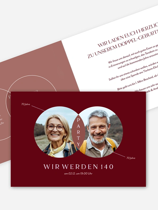Mit der Geburtstagseinladung "Doppelt Feiern" wird aus zwei besonderen Anlässen ein gemeinsamer Moment voller Nähe und Freude. Diese Geburtstagseinladung bringt eure Geschichte zusammen und lädt eure Lieblingsmenschen herzlich ein, diesen Tag mit euch zu teilen. Im Gestaltungs-Tool kannst du die Einladung ganz einfach personalisieren und ihr eure persönliche Note geben. Hochwertig gedruckt und mit viel Liebe gemacht, entsteht so eine Einladung, die verbindet und Lust aufs Zusammenkommen macht.