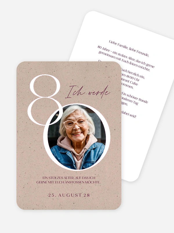 Mit der Einladung zum 80. Geburtstag "Jubeltag" feierst du ein Leben voller Geschichten, Lachen und gemeinsamer Momente. Die Geburtstagseinladung wirkt persönlich und herzlich – genau richtig, um Lieblingsmenschen einzuladen und gemeinsam anzustossen. Du kannst deine Einladung zum 80. Geburtstag ganz einfach im Gestaltungs-Tool anpassen und so deine eigene Note einfliessen lassen. Gedruckt mit viel Sorgfalt und schnell bei dir, damit die Vorfreude direkt starten kann.