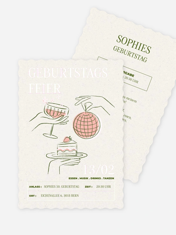 Die Geburtstagseinladung "Let’s Glow" bringt genau die richtige Mischung aus Stil, Leichtigkeit und Partygefühl mit. Handgezeichnete Motive wie Discokugel, Cocktailglas und Geburtstagstorte treffen auf eine ruhige Typografie und machen diese Einladung zum Geburtstag modern und herzlich zugleich. Perfekt für alle, die ihren großen Tag mit Persönlichkeit ankündigen möchten – ohne viel Tamtam, aber mit einem kleinen Wow. Dank der einfachen Konfiguration im Gestaltungs-Tool wird das Geburtstagseinladung gestalten ganz entspannt und macht sofort Freude.