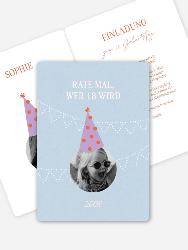 Mit der Einladung zum 18. Geburtstag "Party-Hut" beginnt die Feier schon beim Öffnen des Umschlags. Das verspielte Design steckt voller Leichtigkeit und kleiner Augenzwinker-Momente – perfekt für einen Geburtstag, der mit Freude und guter Laune gefeiert wird. Die Geburtstagseinladung kannst du ganz unkompliziert im Gestaltungs-Tool personalisieren und nach deinen Wünschen anpassen. Gedruckt auf hochwertigen Papieren wird daraus der ideale Startschuss für einen Abend mit deinen Lieblingsmenschen.
