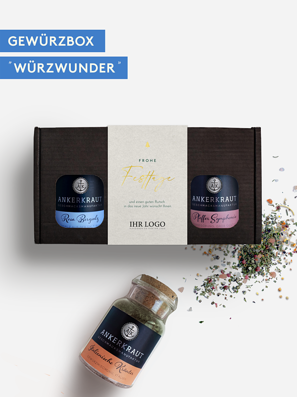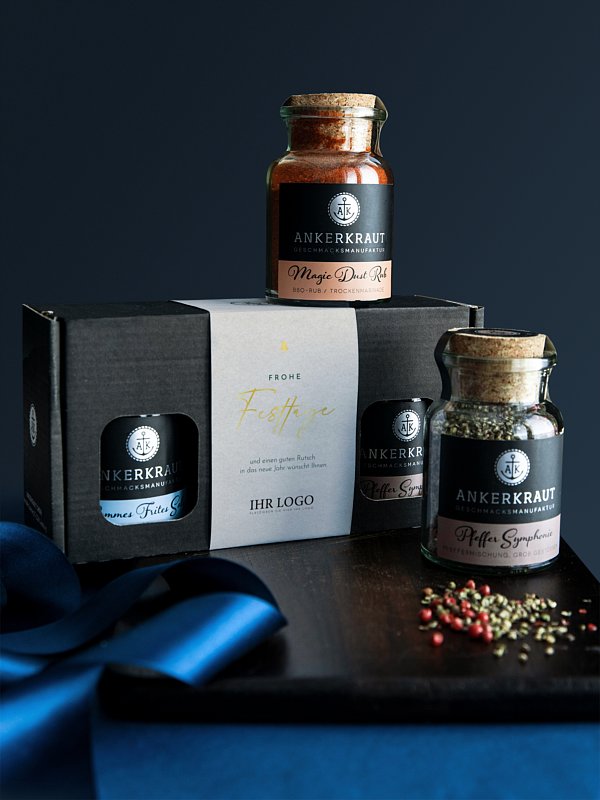 Zu Weihnachten ein besonderes Geschenk: Die Gewürzmischung "Edles Fest" ist nicht nur ein edles Dankeschön für Ihre Kunden, sondern auch noch personalisierbar mit Geschenkbox.