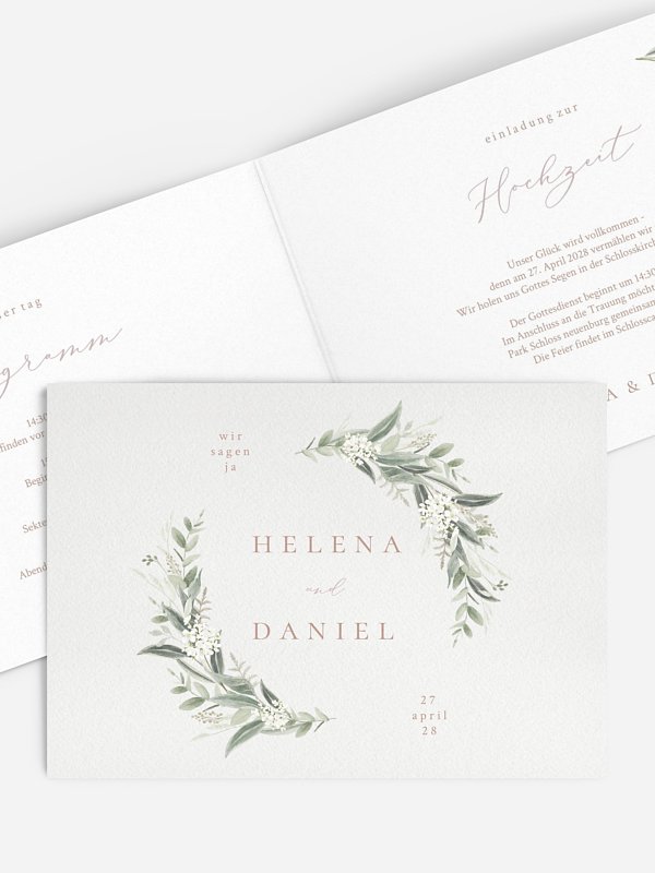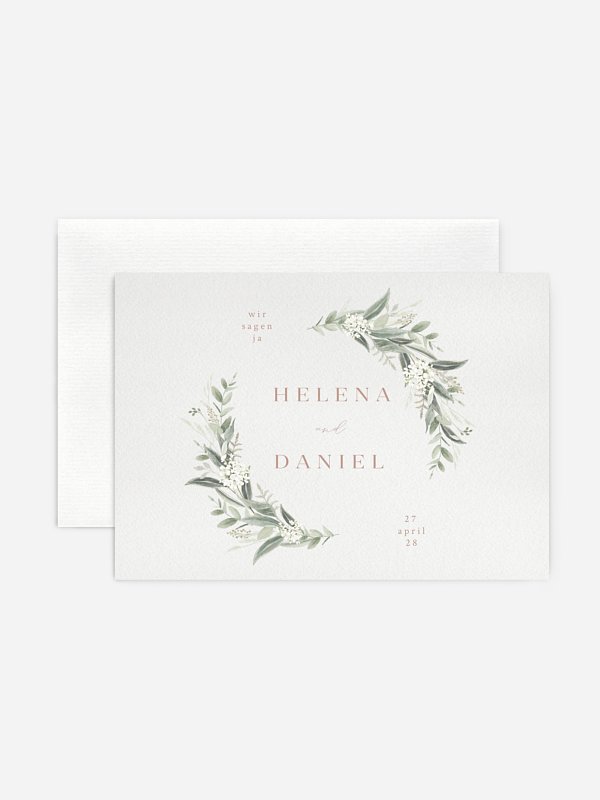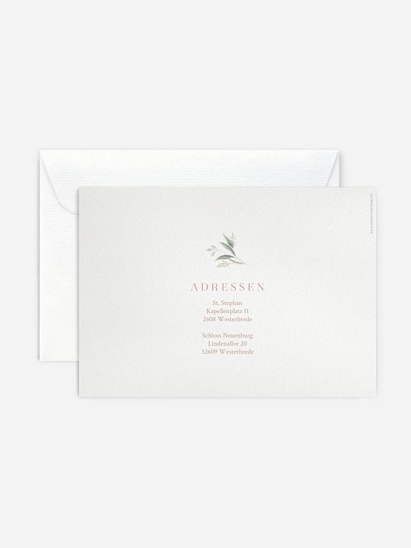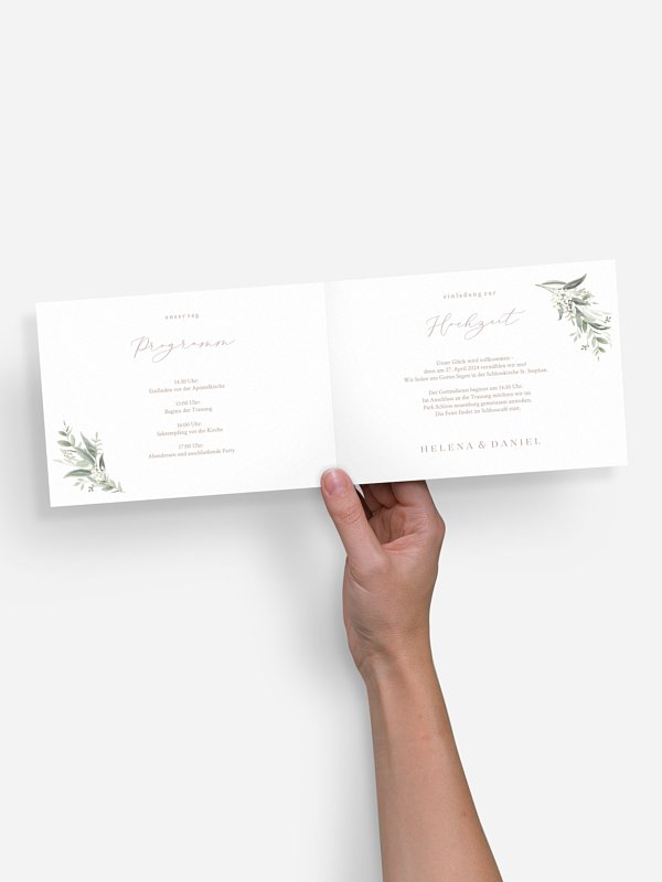 Handgemalte Greenery-Elemente bilden den Fokus auf der Hochzeitseinladung "Beauty of Nature".