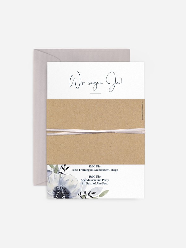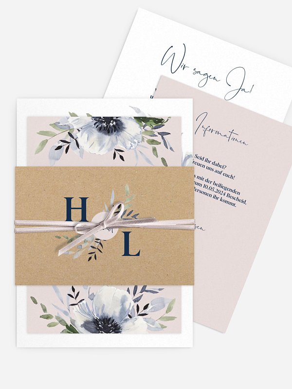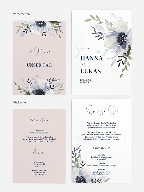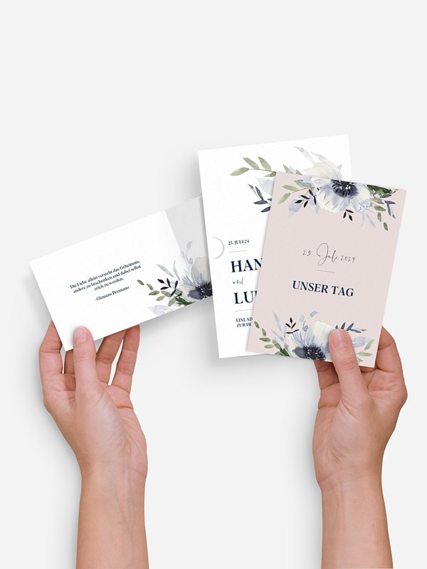 Die wunderschöne Hochzeitseinladung "Blue Anemone" ist ein echter Trendsetter – wählen Sie Ihre Lieblingsfarbe.