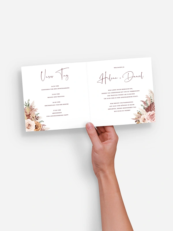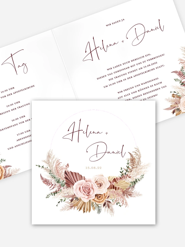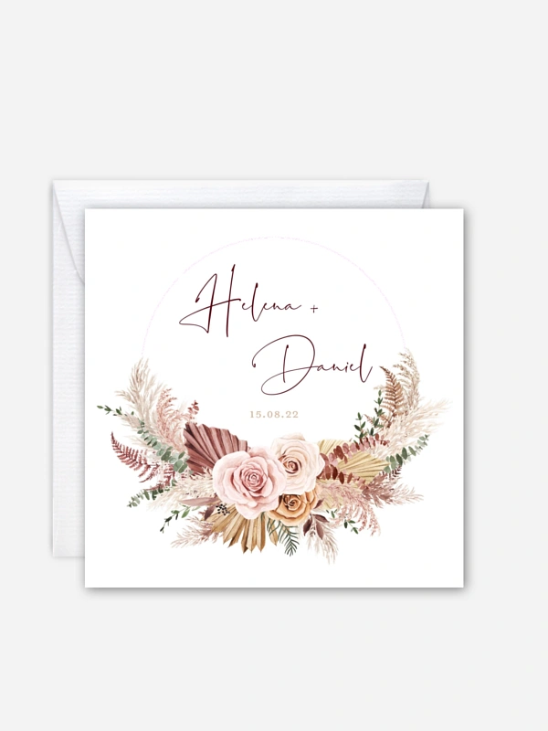Laden Sie mit der Hochzeitseinladung "Bohemian Rose" elegant im modernen Boho-Stil zu Ihrer Hochzeit ein.