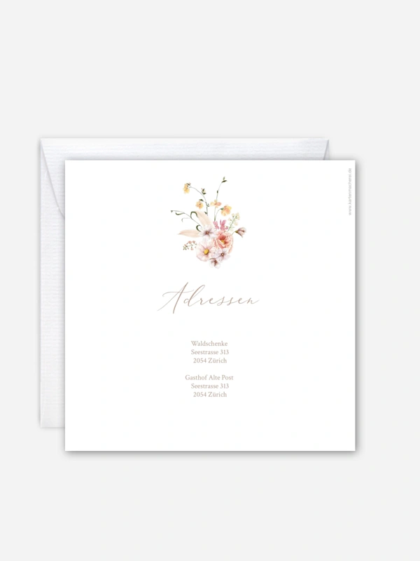 Zarte, wunderschöne Blüten umspielen Ihre Namen auf der Hochzeitseinladung "Flora".