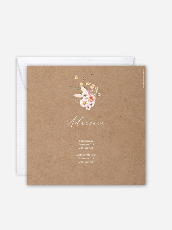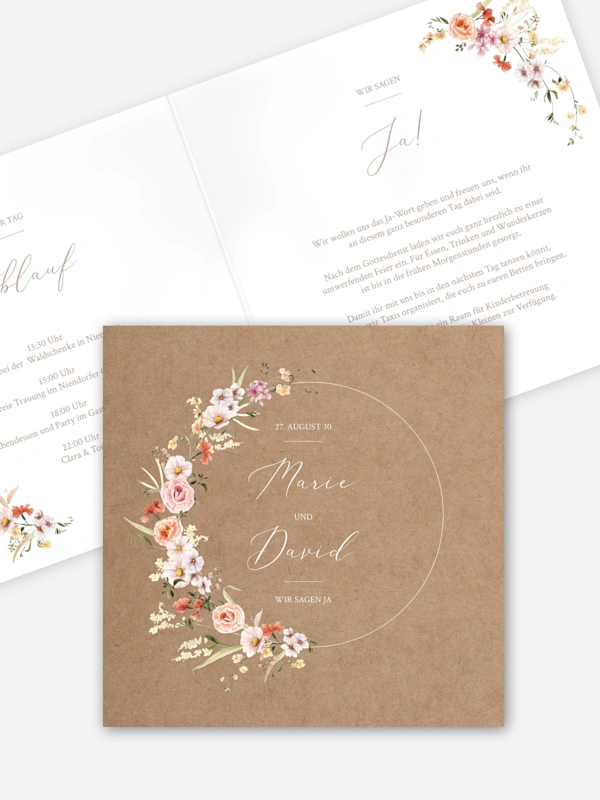 Zarte, wunderschöne Blüten umspielen Ihre Namen auf der Hochzeitseinladung "Flora".
