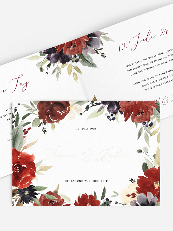 Handgemalte Blüten und Blätter zieren die wunderschöne Hochzeitseinladung "Floralia".