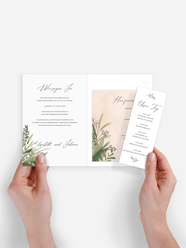 Die liebevoll gestaltete Hochzeitseinladung "Green Garden" überzeugt mit handgemalten Elementen.