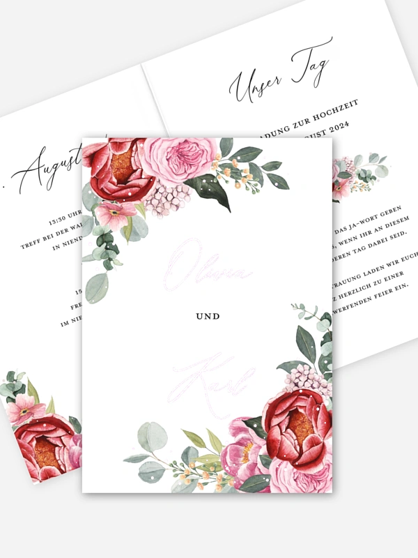 Knallige Blüten und dezenter Eucalyptus auf der Hochzeitseinladung "Pink Flowers" bilden ein wunderschönes Bouquet.
