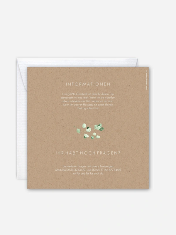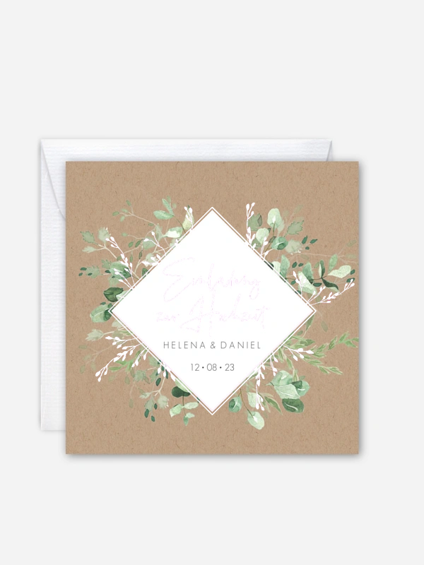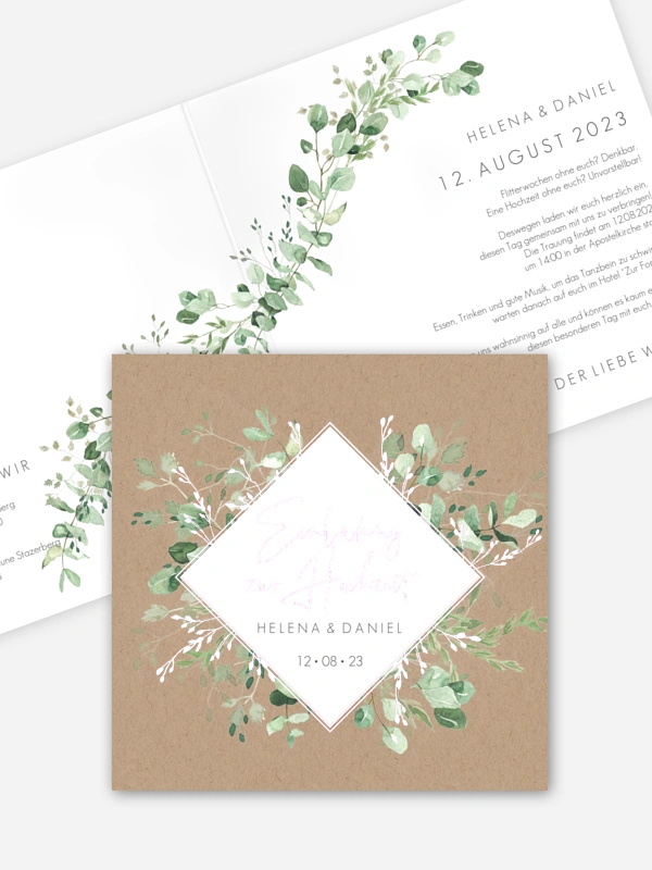 Die Hochzeitseinladung "Rustic Gold and Green" vereint alles was eine moderne Einladung braucht: Kraftpapierlook, veredelte Elemente und handgemalte Blätter.