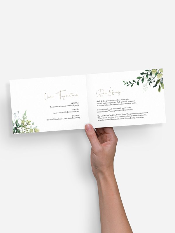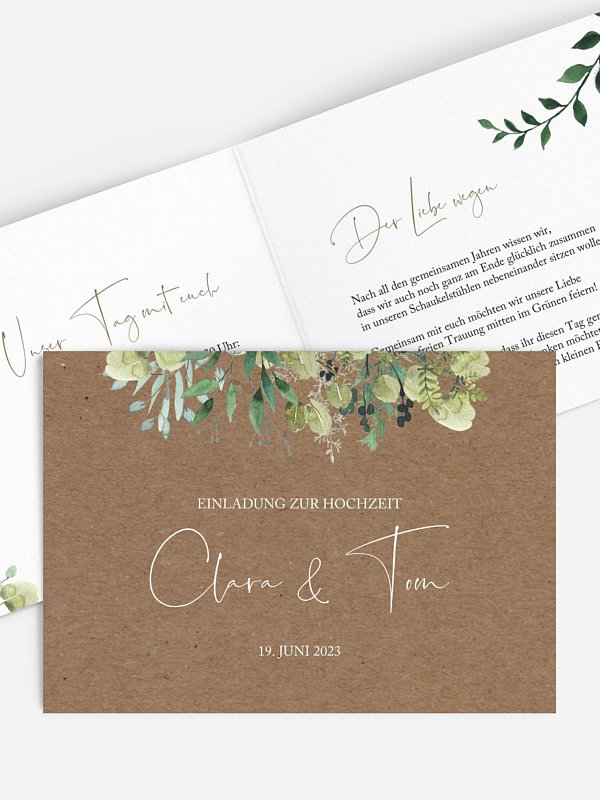 Sie lieben den modernen Greenery-Stil, mögen aber auch einen rustikalen Touch? Dann ist die Hochzeitseinladung "Rustic Green Magic" die perfekte Wahl.