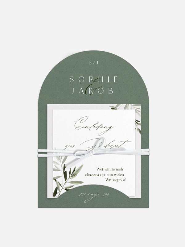 Zarte Olivenzweige versprühen ein warmes Urlaubsgefühl auf der Hochzeitseinladung "Tiny Leaves".