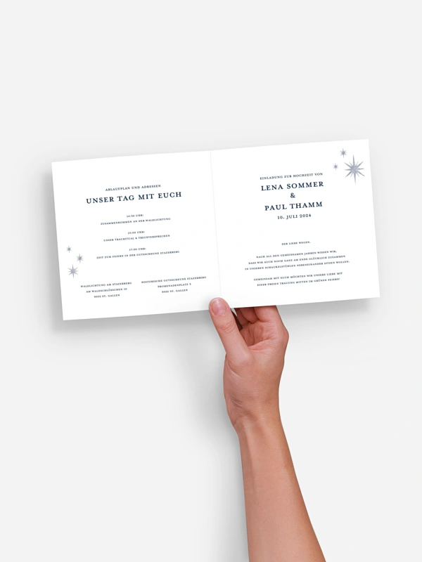 „Es war alles perfekt! Die Qualität der Karten und Umschläge ist erstklassig, das Druckbild hervorragend und der Service bestens.“ (Familie Hübner)